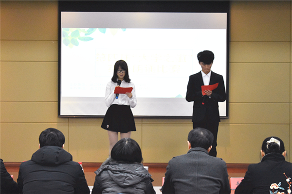2017年12月12日下午,外国语分院在7教409举办第四届英语朗诵比赛。本次比赛有幸外国语分院副经理张友文老师,大学英语教学部主任赵倩老师,英语专业教学部主任张菊香老师,英语专业老师姜原老师,商务英语专业老师张晓文老师,以及本次比赛负责老师王冶老师和杨菲老师。本次比赛由张海山、付珂宁同学主持。