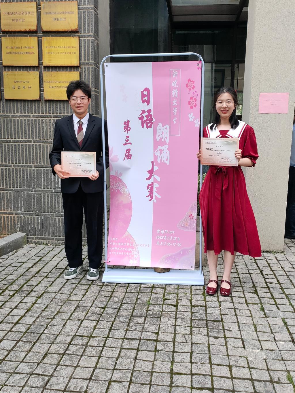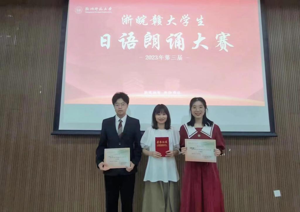 5月13日,由中国日语教学研究会浙皖赣分会和杭州师范大学3044永利共同主办的第三届浙皖赣老员工日语朗诵大赛在杭州师范大学圆满落幕。来自浙皖赣3省高校的47名选手参加了本次比赛。经过激烈角逐,公司日语专业2020级徐思源、柯远洋同学分别获得二等奖和三等奖的好成绩。日语专业教师江婷、外教竹内蔚晴担任本次比赛的指导老师。