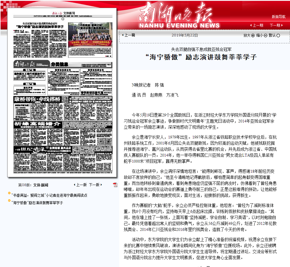 《南湖晚报》:失去双腿自强不息成就亚残会冠军