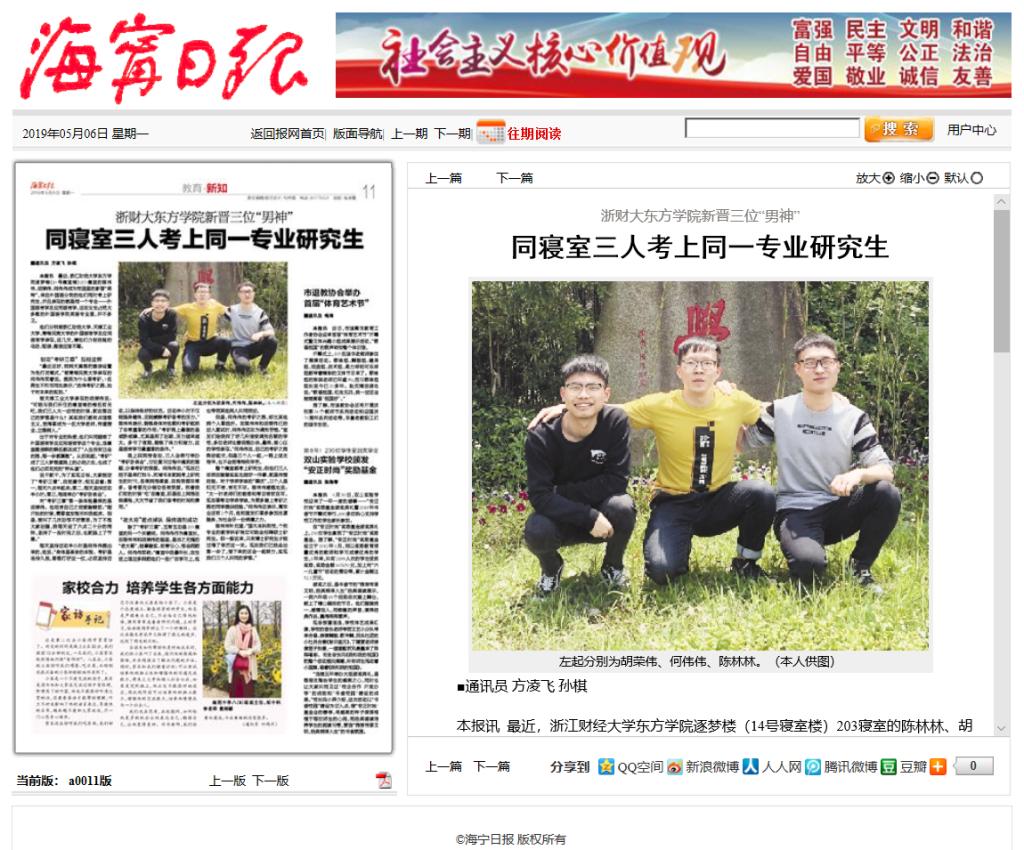 《海宁日报》:浙财大东方公司新晋三位“男神” 同寝室三人考上同一专业研究生