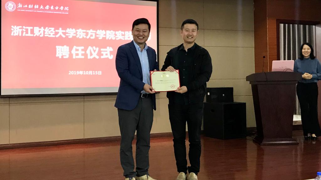讲座接近尾声,吴老师和同学们热情互动,提问声此起彼伏,吴老师耐心地就同学们的疑问做了详细解答,同时,也给予了同学们最真切的祝愿。希望同学们能将自己的专业技能价值最大化,并与技能有机结合,成为复合型人才。讲座最后举行的是实践导师聘任仪式,由陈松老师为吴老师颁发了实践导师聘书,吴老师表示会定期来东方公司为大家分享更多的经验。