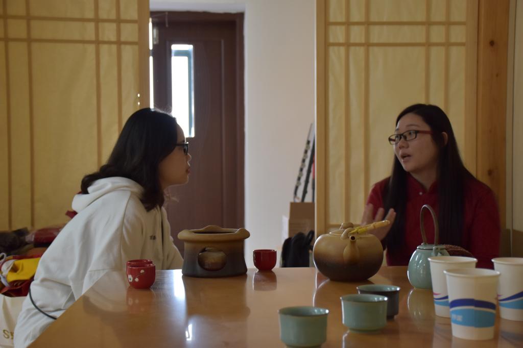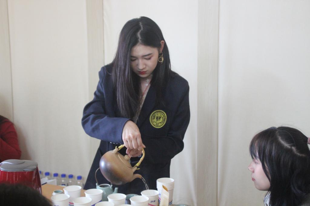 与此同时进行的,还有吴璇、张灵芝正细说她们与茶的渊源,并热情邀请同学一同品味红茶、白茶,小小的日本馆一角,茶香四溢,笑声飞扬。