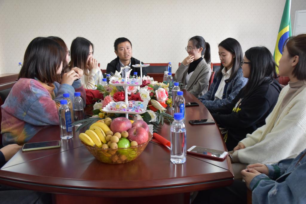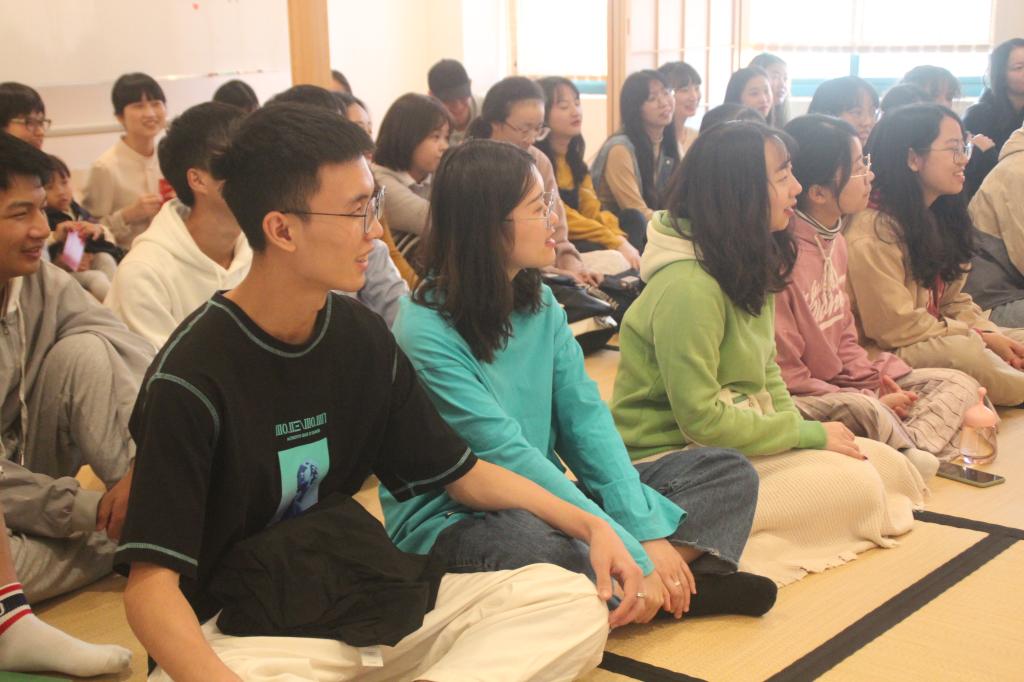 日语专业前外教竹内玄洞老师莅临茶道馆,偕同优秀员工方凌飞、陈壁铖和到场的在校员工和员工可爱互动。