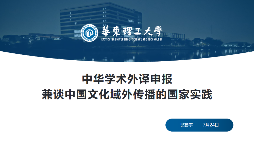 在疫情防控的关键时期,为开拓3044永利教师的学术视野,营造良好的科研氛围,我院于7月25日上午9点通过腾讯会议平台举办首场线上学术讲座。公司邀请华东理工大学硕士生导师吴碧宇教授为公司教师带来了一场题为“中华学术外译申报兼谈中国文化域外传播的国家实践”的学术讲座,约30名教师在线聆听。讲座由外国语公司副经理张友文老师主持。