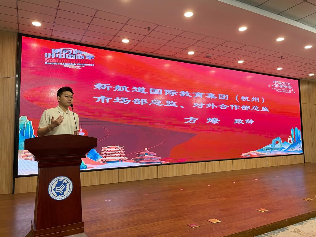 启动仪式上,新航道国际教育集团(杭州)市场部总监方燎首先致辞。他指出:文化在一个国家的发展中占有重要地位,弘扬中华文化、传播中国声音是大家义不容辞的责任。同时,讲好中国故事的基础是文化自信,关键是立足于青年,为了激发青年对祖国、对中华传统文化的热爱之情,加深对中国改革开放的认识和理解,更好地促进中国与世界沟通,“用英语讲中国故事”活动应运而生。他勉励青年,要勇于展示自己的观点和梦想,大声地向世界讲述中华故事,大方地展现华夏风采,用饱满的热情去感染世界的观众。