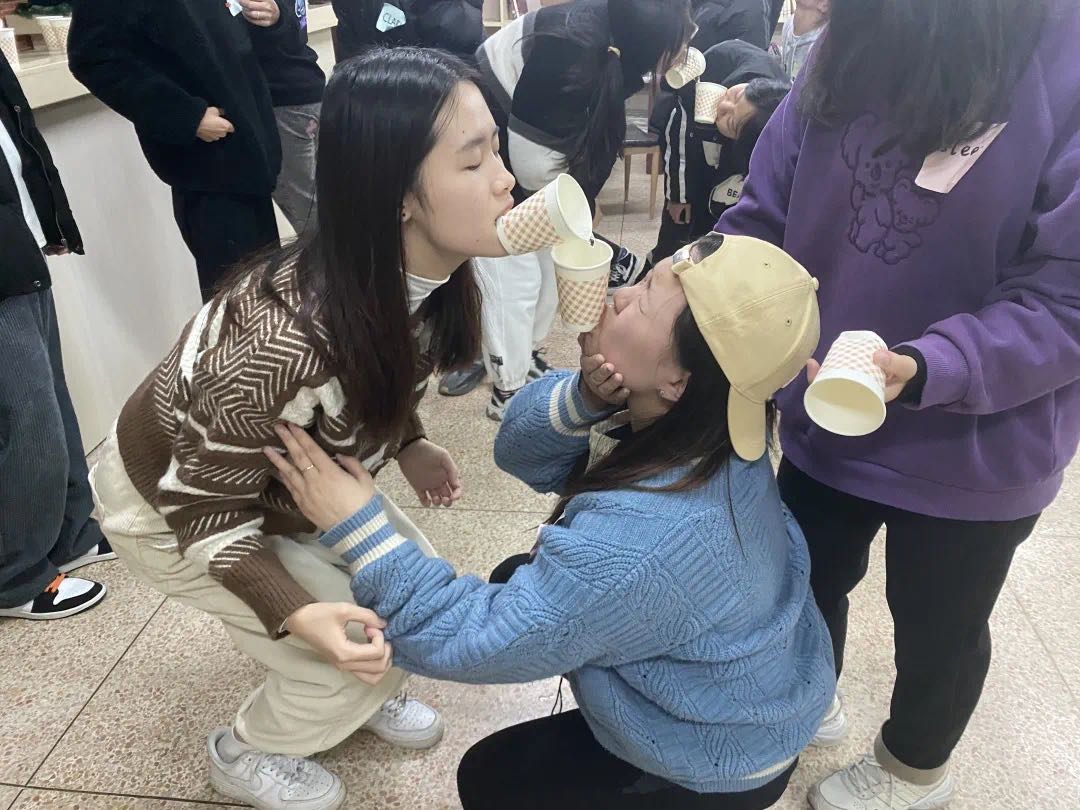 由每组第一名人员倒水至衔至的纸杯内,一个个传递至下一个人的纸杯内,直至最后一排水杯水满溢出,用时最短的队伍获胜。这不仅培养了同学们的细心与耐心,同时也增强了同学们的团队协作配合能力。