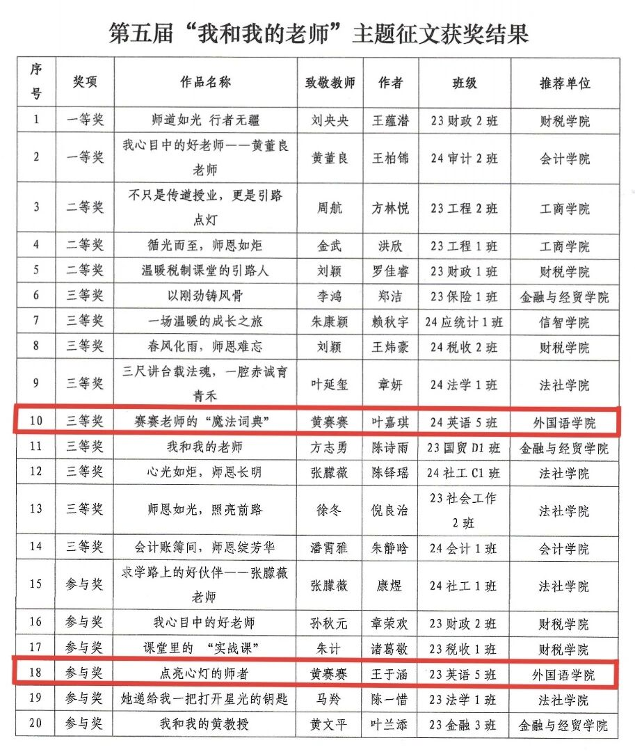 在此,特向获奖同学表示热烈祝贺!纸短情长意未尽,师恩难忘励前行,愿外院学子以笔为媒、以情为墨,在传承师道中汲取力量,在逐梦征程中书写担当,绽放更加绚丽的青春光彩!(文:朱湘怡)