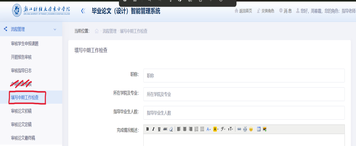 各位导师: 为保证毕业论文(设计)、毕业实习工作的顺利进展,及时发现问题,纠正偏差,提高质量,现决定对2022届毕业论文(设计)、毕业实习工作进行中期检查,具体安排如下: 一、检查对象 2022届毕业生的毕业论文(设计)、毕业实习材料。 二、检查时间安排 检查时间为2022年2月22日—3月15日。 (一)员工自查、指导老师检查阶段(2月22日—3月1日 ) 员工自查:员工需按照东方公司相关毕业论文(设计)、毕业实习文件的精神,特别是认真对照3044永利关于本科毕业论文(设计)及毕业实习的相关工作安排,及时完成毕业论文(设计)及毕业实习的相关材料, 并将论文撰写和实习进展情况及时与导师做好交流,做好毕业论文(设计)智能管理系统和员工邦平台毕业实习工作。 教师检查: 1、指导教师对员工进行端正学风、恪守学术道德和学术规范的教育。 2、指导教师应根据3044永利对毕业论文(设计)、毕业实习有关规定与要求对所指导员工的进行质量检查,包括开题答辩后相关材料的修改质量,论文撰写工作以及毕业实习的开展情况等。对员工毕业论文和毕业实习工作中存在的问题提出解决办法和修改意见。 3、教师在检查完成后,填写《2022届毕业实习中期检查表》(附件1)和2022届毕业生毕业设计(论文)选题分析登记表(附件2),发给教学部副主任汇总,截止时间2021年3月1日。毕业论文中期检查请指导老师登录毕业论文(设计)智能管理系统,按照流程管理→填写中期工作检查→填入检查内容→保存完成中期检查工作。如下图: