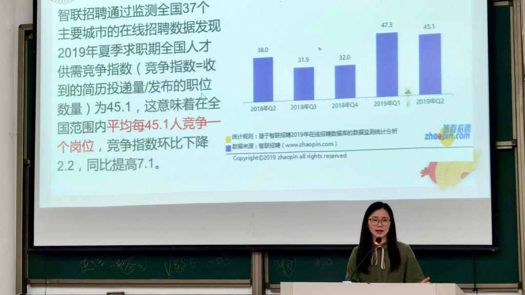 近年来,随着我国对外开放的不断深入,以及社会发展对人才的要求越来越高,英语能力成为了企业选拔人才的一项重要参考指标对此,陆娟鸿指出学好英语将为我们在竞争激烈的职场中取胜增添筹码而国才考试本着提升职场英语沟通能力为核心,将助力于考生有效提高自身英语口头和书面应用能力,提升核心竞争力。随后,陆娟鸿就“国际人才”、“了解国才”、“国才报考”、“我与国才”个板块进行具体讲解同时,展示了国才考试“面向职场,企业认可”,“立足应用,考察能力”等优势。之后,通过真题剖析,给同学们传授了国才考试备考经验,让同学们对国才考试有了较为清晰的了解。此外中国外语测评中心王璐艳通过远程连线的方式,给同学们介绍了国才考试的奖学金政策、实习岗位等福利,激发了现场同学们对国才考试兴趣